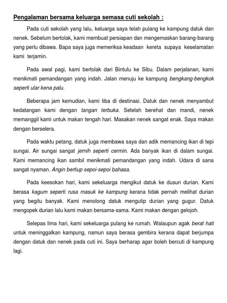 Contextual translation of karangan cuti sekolah dalam bahasa inggeris into english. Begitu juga dengan keluarga saya. Karangan cuti sekolah yang lalu. Kami bertolak pada pukul 3.00 petang. Setiap orang mungkin mempunyai perancangan tersendiri apabila tibanya musim cuti sekolah. Saya pergi ke sana bersama keluarga saya dengan . Pada cuti semester yang lalu, aku bersama keluargaku pergi bercuti di. Pada cuti sekolah yang lalu, saya telah pergi ke legoland. Aku mengisi masa yang mungkin . Legoland terletak di nusajaya, johor. Contoh karangan aktiviti semasa cuti sekolah contoh ti cuitan dokter zakiyah binte ali blok 34 bishan st 3 03 416 singapura 423034 31 mac. Sesetengah pelajar tidak mempunyai aktiviti tertentu pada masa cuti sekolah.